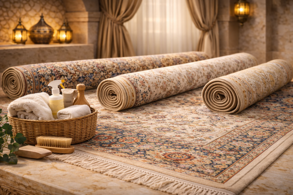 Living in Riyadh means busy schedules, long working hours, and limited time for household tasks. Weekly carpet dry cleaning in Riyadh quickly becomes difficult — large area rugs, prayer rugs, luxury Persian carpets, wall-to-wall moquette, and everyday home carpets all need regular deep cleaning to remove dust, allergens, stains, and odors.